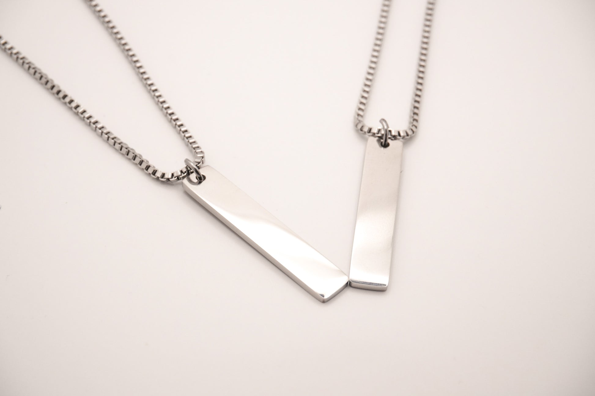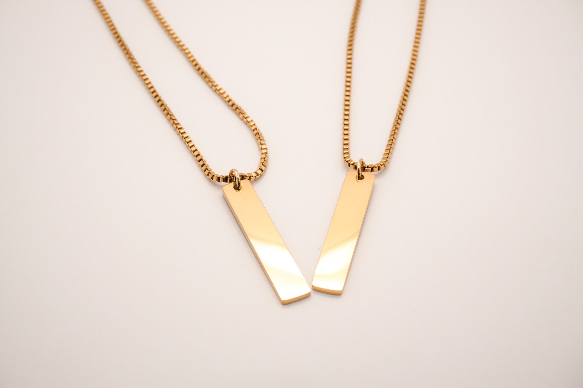 A meaningful set of two rectangular pendant necklace crafted in premium stainless steel with an elegant 18K gold plating. This set represents how two souls can come together to complete each other