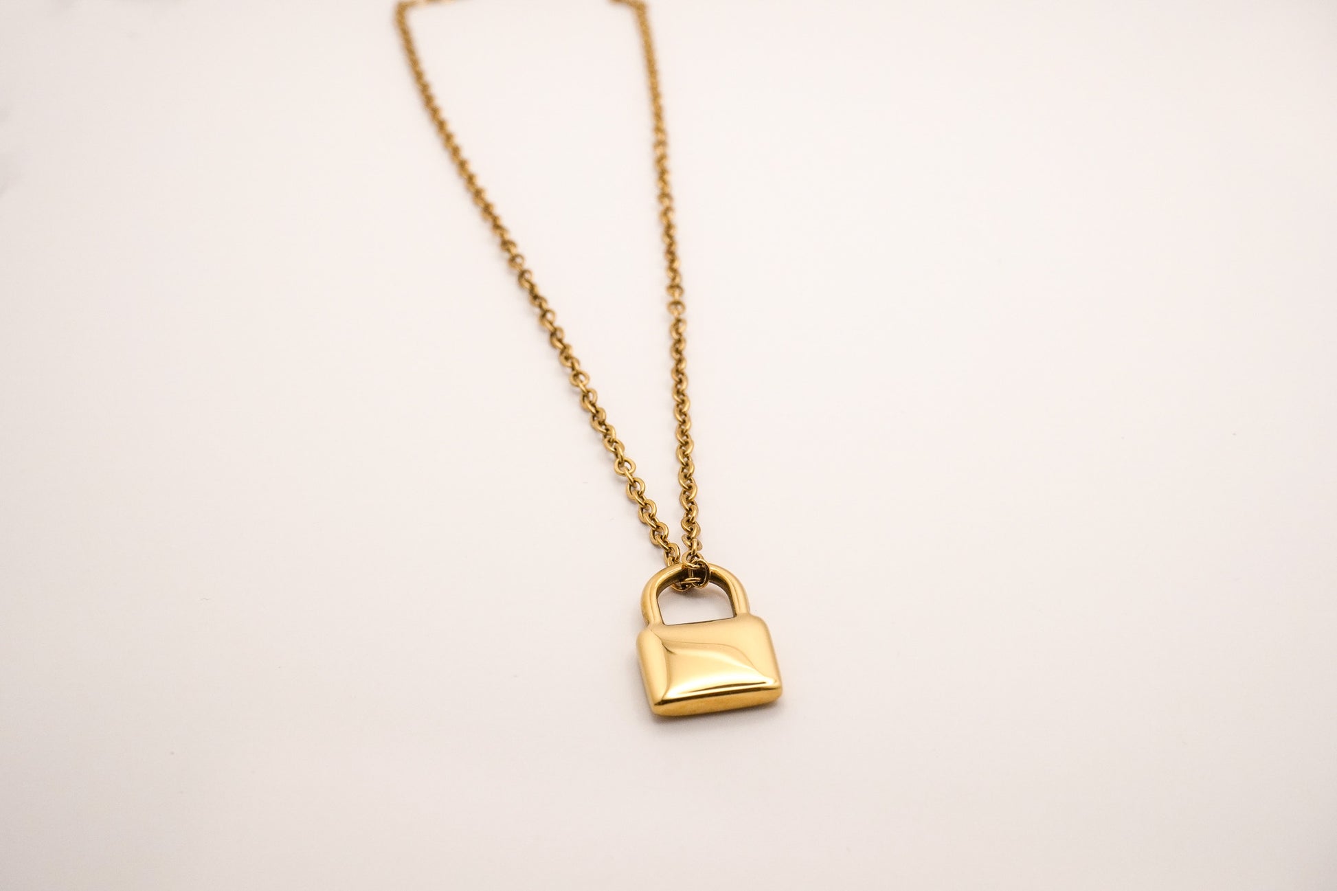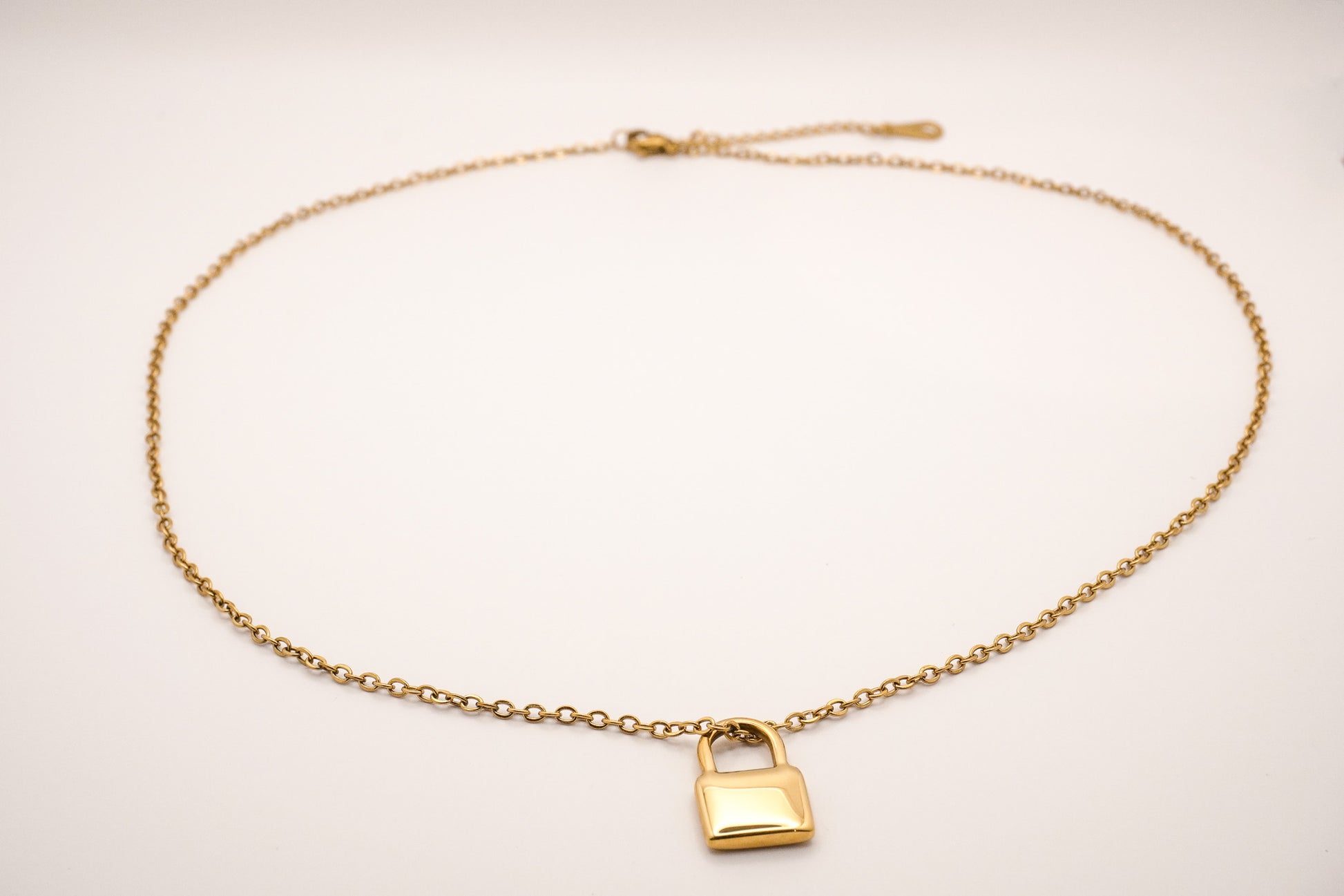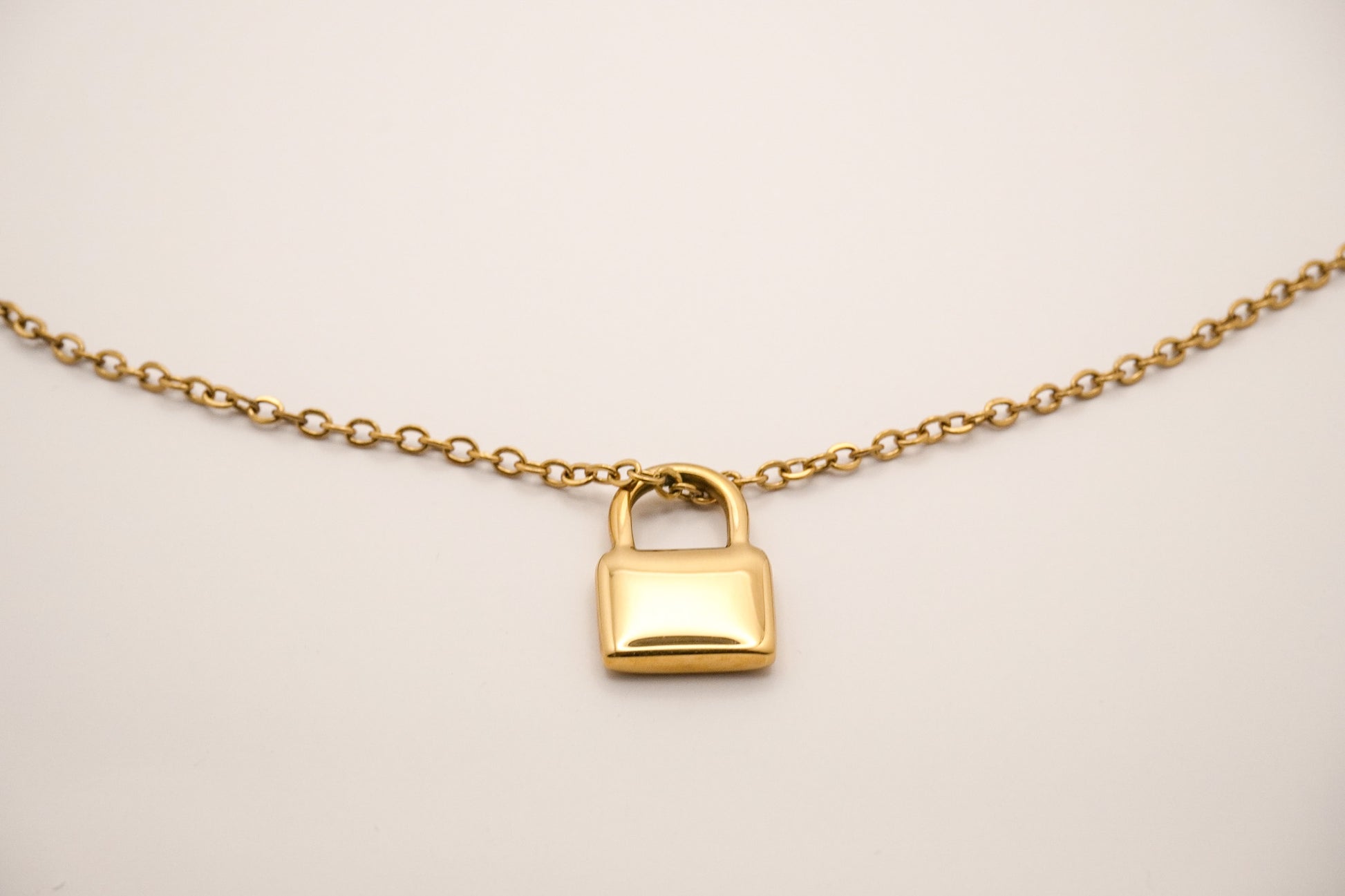 A lock pendant necklace crafted in premium stainless steel with a luxurious 18K gold plating. Representing eternal love and commitment, this timeless piece can be personalized with precision laser engraving, making it a meaningful gift or keepsake to treasure forever.